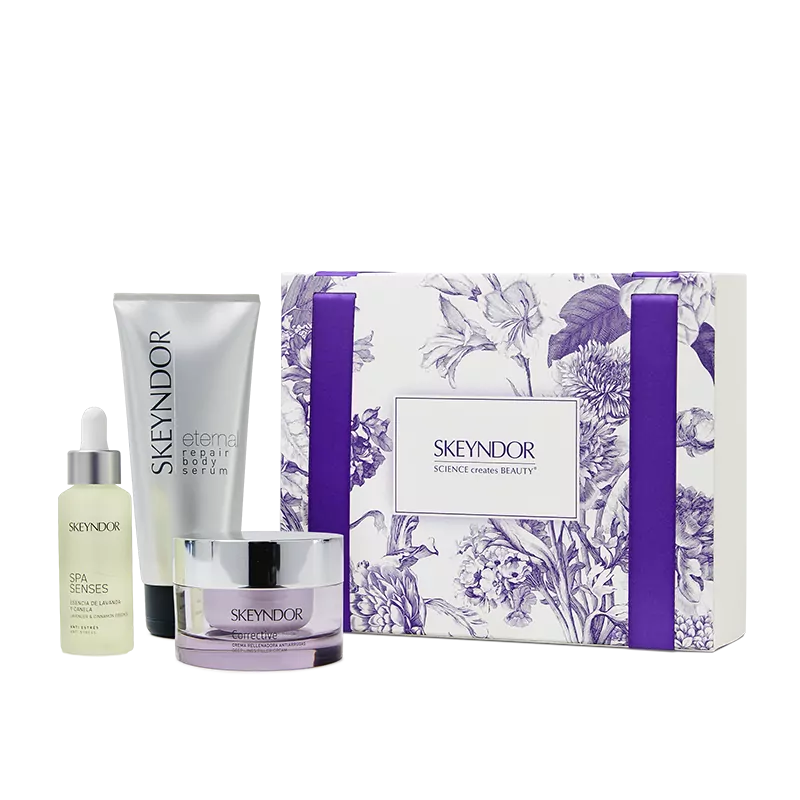 El kit Corrective de Happy Skin days contiene una selección de los productos más premium de Skeyndor.La crema correctora de arrugas profundas y lineas de expresión o la emulsión rellenadora de arrugas de la línea corrective formuladas para alisar las arrugas de expresión del rostro, el serum antiarrugas corporal de Eternal con liposomas de células madre de origen vegetal y la esencia de lavanda y canela antiestrés de Spa senses, que nutre y perfuma la piel.
